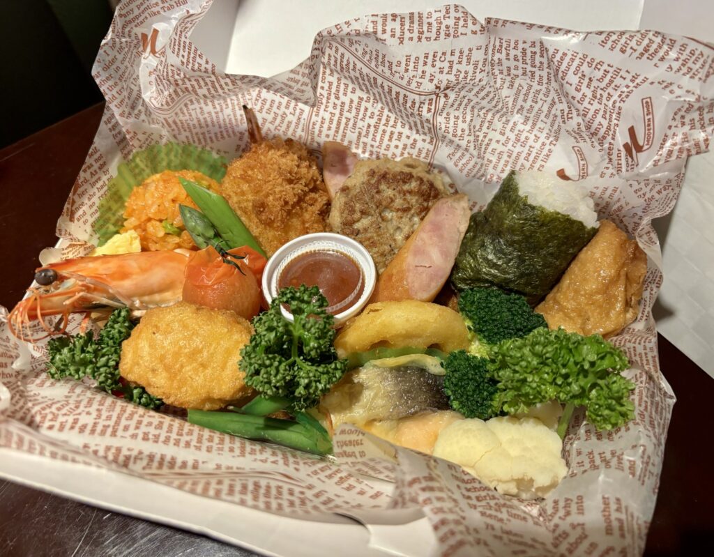 おかず系はハンバーグ、ボイルしたエビ、からあげ、カニクリームコロッケ、焼き鮭、ウインナー、ポテト。