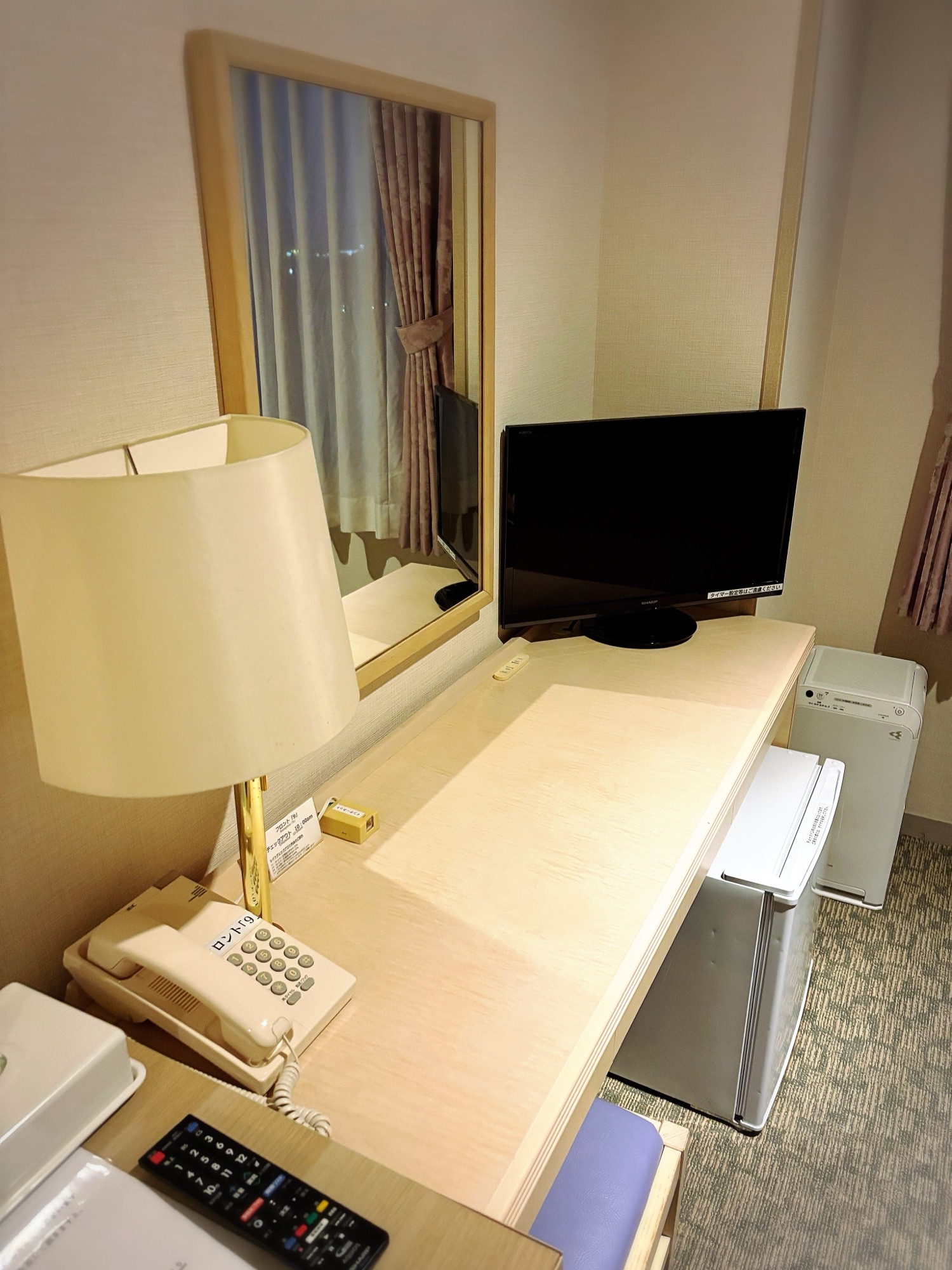 デスク脇には、湯沸かしポットと緑茶・紅茶のティーパック、ドライヤーなどの備品がそなえてありましたよ♪