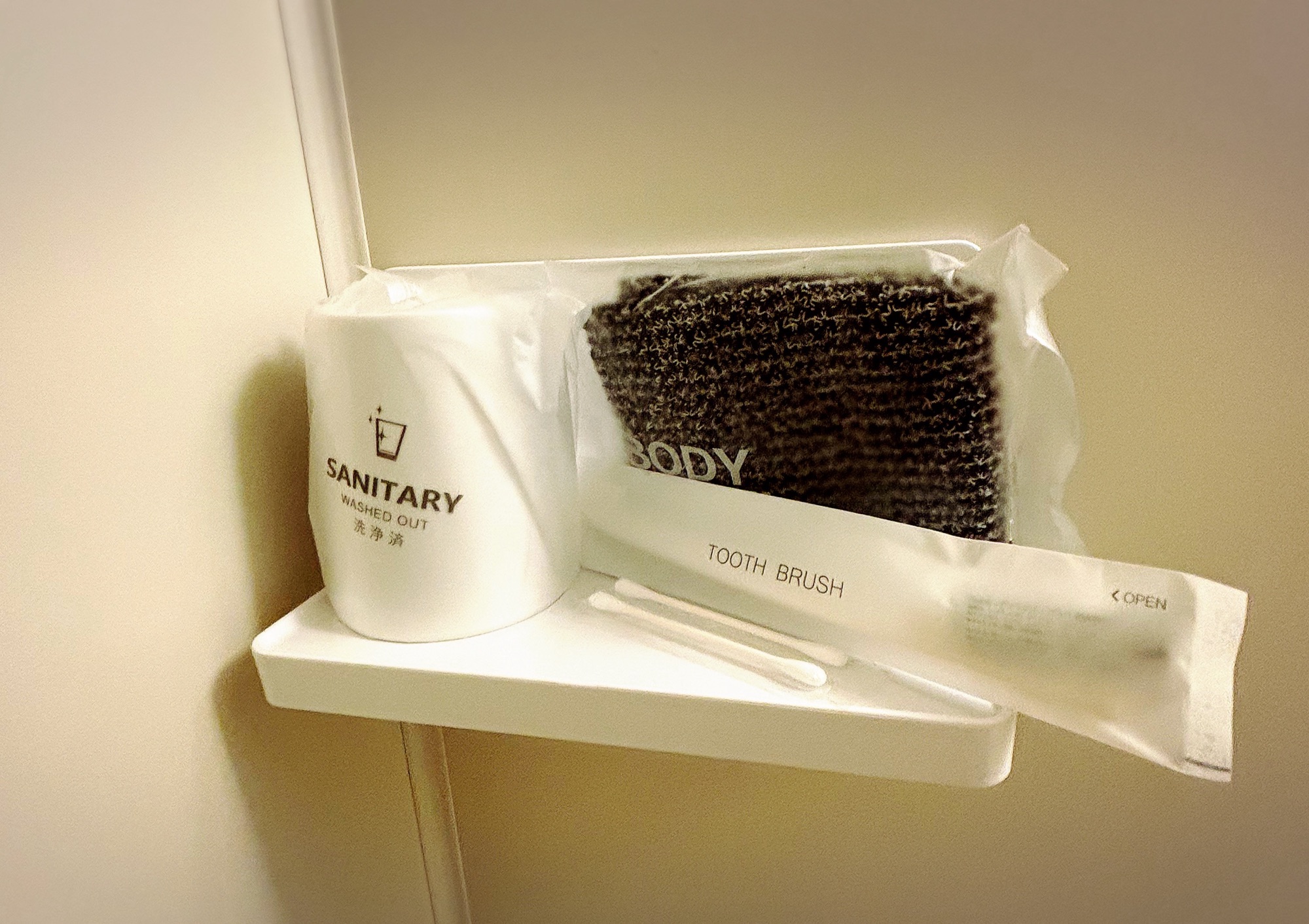 それから、お風呂場には、歯ブラシや綿棒、ボディータオルがあらかじめ設置してあります。