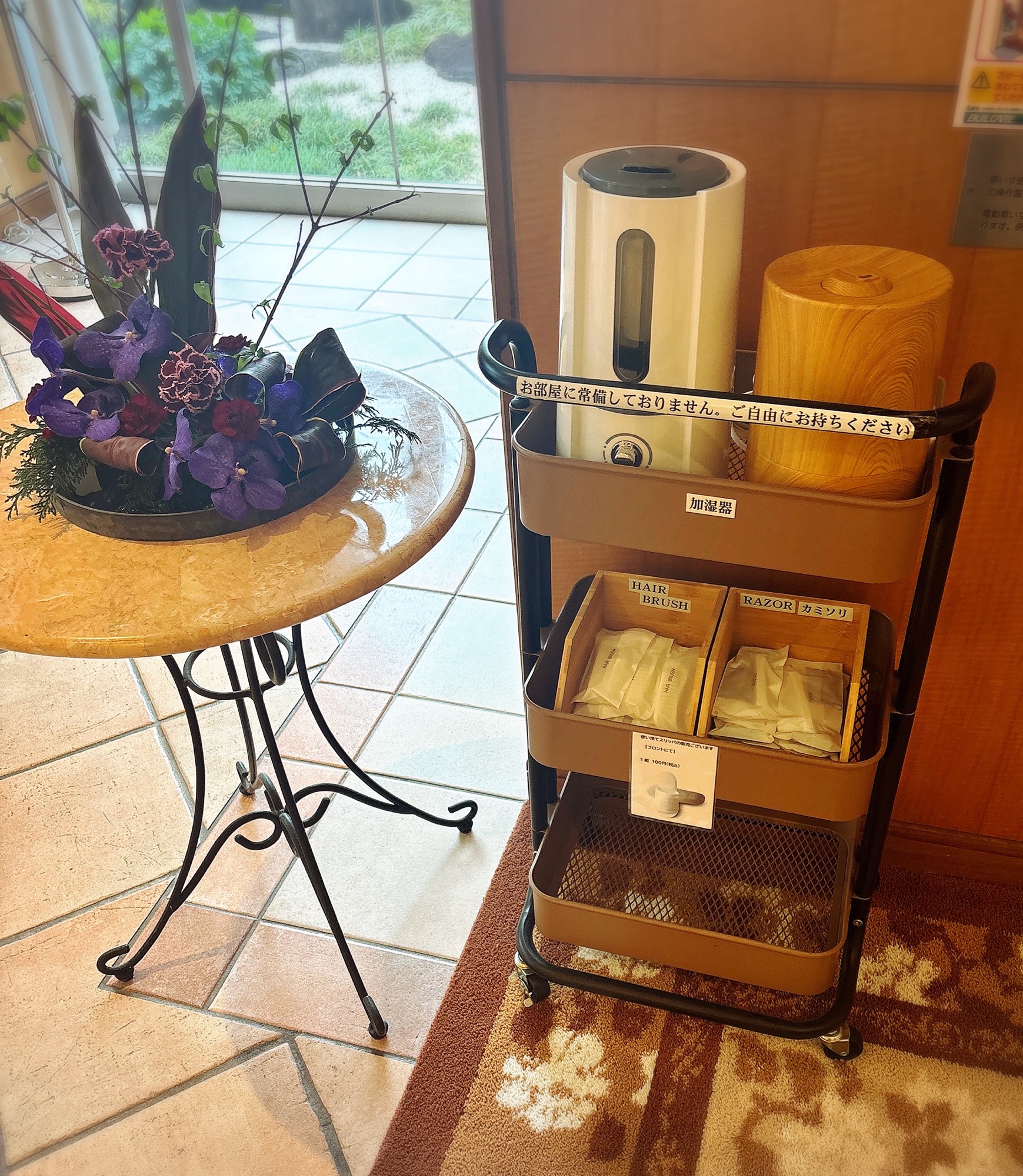 これ以外にもエレベーター脇に加湿器やヘアブラシ、カミソリが自由に取っていけるようになっていました!