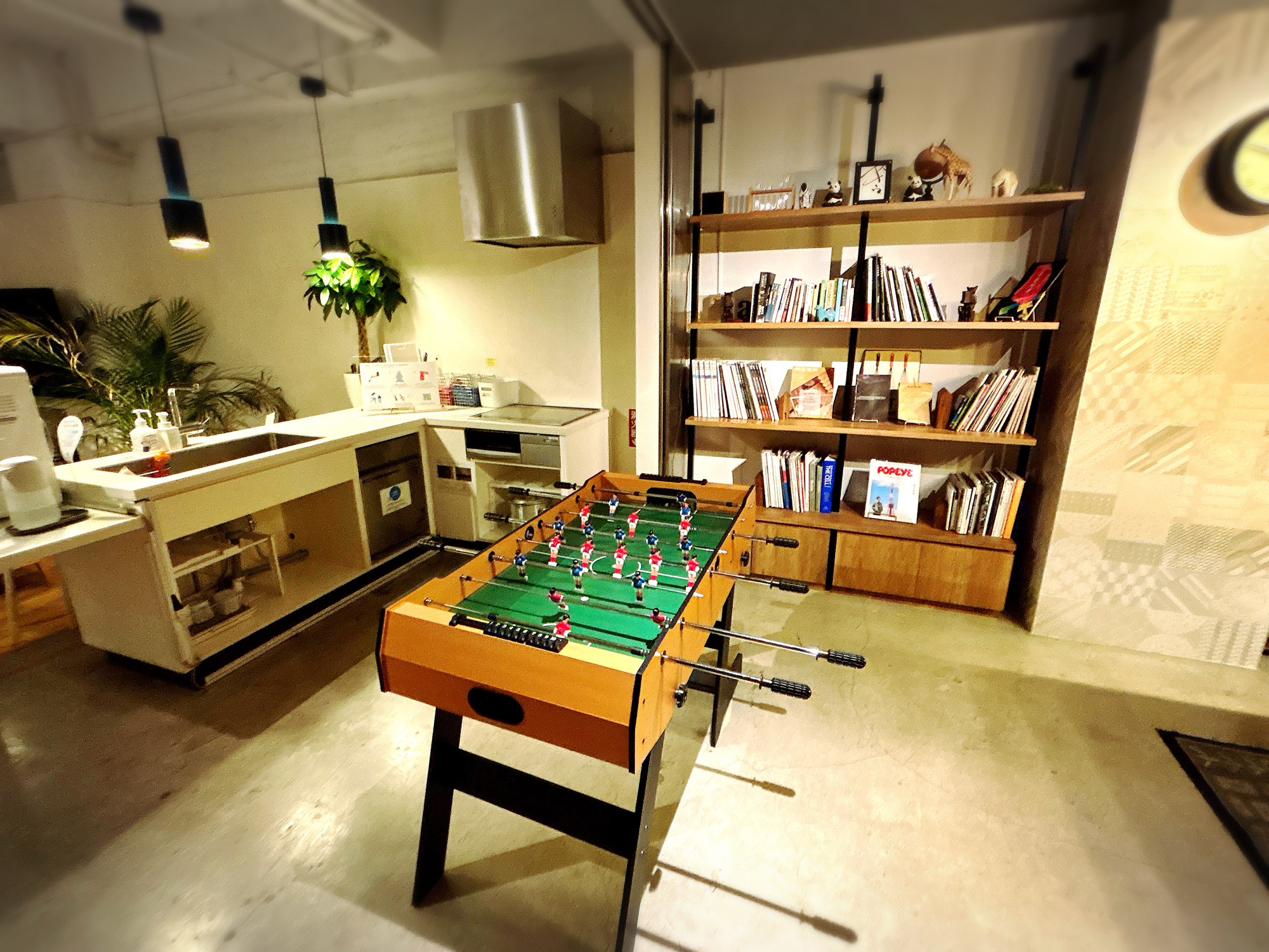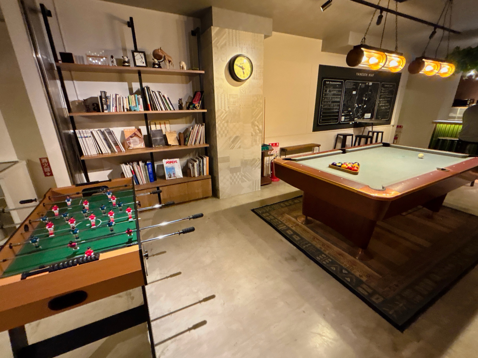 人がいらしたので写真は控えたのですが、ビリヤード台の奥には電子レンジなどなどが充実したキッチンスペースがもっと広がっています。